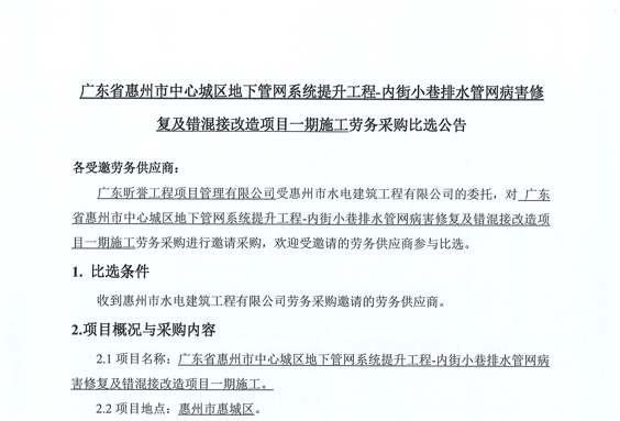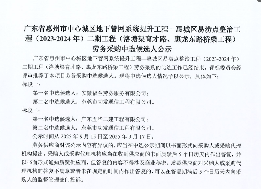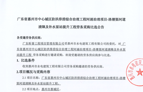 廣東省惠州市中心城區防洪排澇綜合治理工程河涌治理項目-洛塘渠河道清障及補水泵站提升工程勞務采購(第二次)中選候選人公示……